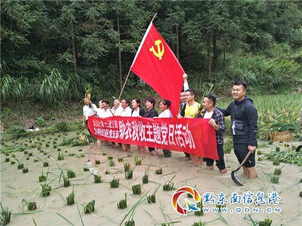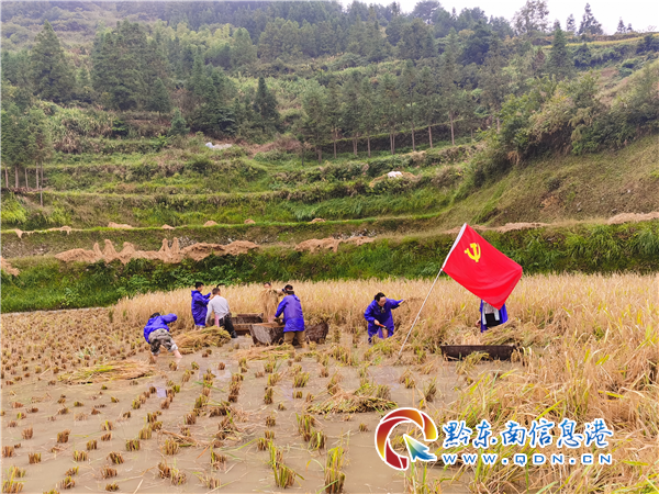 本網訊 九月金秋,稻谷飄香,田野上下到處是金燦燦的一片,西江鎮今年的田野與往年相比顯得格外不同,村村的田坎上多了一面迎風飄揚、紅色飄飄的彩旗,在連綿的細雨天顯得格外鮮艷,走近一看,見到的是迎風飄揚的黨旗。這是雷山縣西江鎮黨員干部、扶貧攻堅先鋒隊,與秋糧時間賽跑,為缺乏勞動力農戶收割糧食,顆粒歸倉。