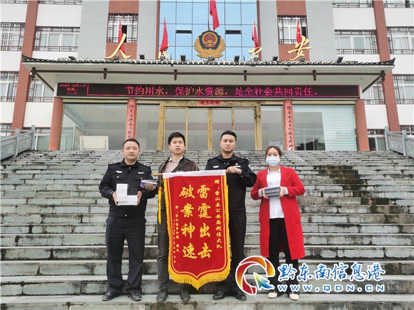 本網(wǎng)訊  10月28日下午,貴州省雷山縣佳通訊移動營業(yè)廳老板楊某和店長龍某情帶著一面普寫有“雷霆出擊,破案神速”八字的錦旗到公安局刑偵大隊(duì)值班室,感謝民警快速破獲手機(jī)被盜案,追回23部手機(jī)價(jià)值五萬余元的經(jīng)濟(jì)損失。