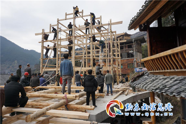 雷山縣十三項國家級非物質(zhì)文化遺產(chǎn)之一,備受各界關注。吊腳樓的整個營造過程都有苗家人修房造屋的各種神秘祭祀活動,而上梁儀式更是整個修房過程中最為濃重的民俗活動。
