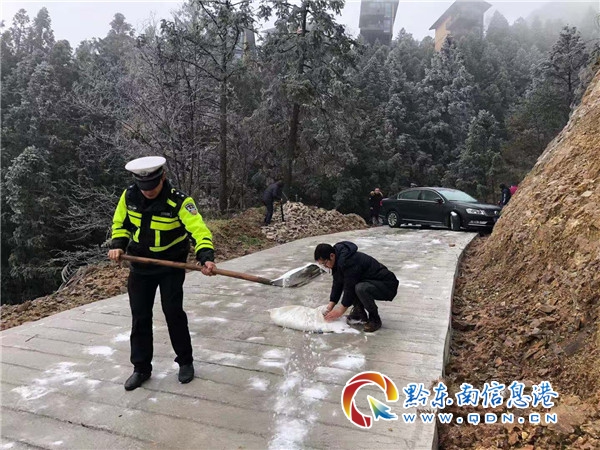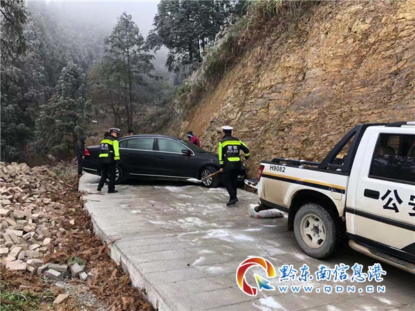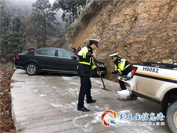 受強冷空氣影響,貴州省雷山縣大部分地區氣溫驟降,氣溫均降至0度以下,地勢較高路段出現結冰現象,致使交通受阻。2020年12月17日,該縣公安局交警大隊西江中隊民警在龍塘村開展大走訪活動中,發現一車輛黑色大眾轎車由于路面濕滑,車輛側滑橫在路中間,前后輪子掉進了公路邊溝,駕乘人員正束手無策的等待。為了及時幫助五名駕乘人員解決困難和及時恢復公路暢通,民警從警車上拖出一袋工業鹽,對附近路段進行撒鹽除冰,并找來千斤頂、木棒將車輛支撐起來,與駕乘人員攜手共同將車輛推回公路。民警們一邊撒鹽一邊幫著推車,皮鞋濕透了,手凍腫了,但是看著在他們的努力工作下,被困車輛重新起航踏上回家的路,消失在風雪里,民警們露出了會心的微笑。