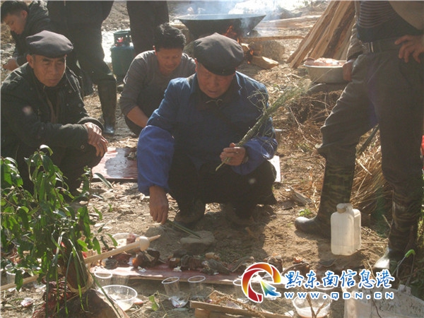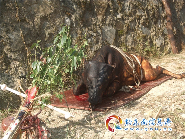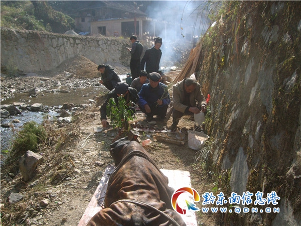 本網訊 為推動消防安全人人有責,確保村寨火災形勢持續穩定,進一步做好冬春季節火災防控工作。12月21日(農歷十一月初七)“戊戌”日,雷山縣西江鎮黃里村(高速公路搬遷新寨)44戶村民自籌資金(每戶200元)購買一條黃牛8000多元在隔河的村寨對面河沙灘,舉行“掃寨”活動。筆者在現場采訪看到,當天上午11時,該寨在拉牛進場前,將大路小道用稻草捆綁欄路并派人守護,不準人群車輛進寨,12位助手與祭師一道走村串戶,每到一家在大門口擺放十三個酒碗,并將酒灑在地上,祭師嘴里叨念著“消防安全人人有責,永遠平安無事”的“掃寨”等詞語,然后進家將火坑撒水滅火。經過一個多小時后,將拉牛進“掃寨”場地宰殺,才把已封路的稻草拆除,讓人群車輛通行;當天各家各戶還邀請寨外房族兄弟和在外工作兄弟姐妹及親戚朋友前來“見證”。當晚大家在河灘“掃寨”地酒肉飯飽后,將碗筷等生活用具洗干凈方能帶回家。 據了解,當天,與黃里大寨鄰近的中寨村154戶,每戶自籌資金100元,購買一頭15000多元的黃牛,也與黃里新寨同樣按照傳統民間“掃寨”村規舉行開展“掃寨”活動。