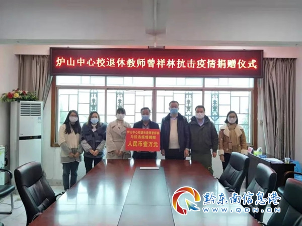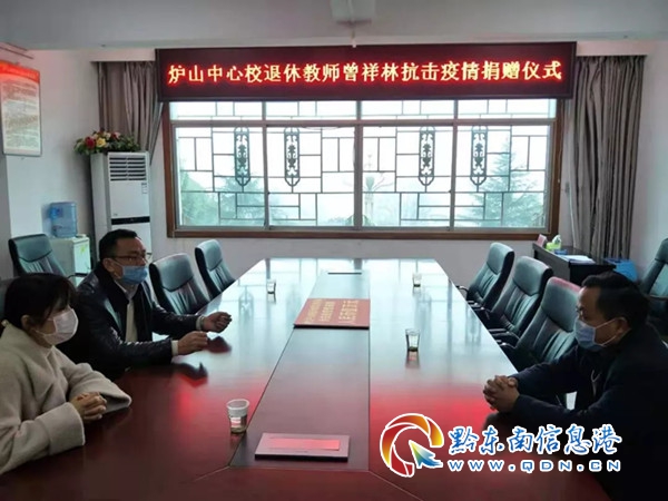 2月11日上午,爐山鎮辦公大樓四樓會議室迎來一名爐山中心校退休教師,一場抗擊疫情愛心捐款儀式在這里舉行。捐贈儀式上,爐山中心校退休教師曾祥林向爐山鎮捐贈1萬元,用于全鎮開展疫情防控工作。參加此次捐贈儀式的有爐山鎮黨委副書記、鎮長黃大慶和爐山鎮應對新型冠狀病毒感染的肺炎疫情防控工作領導小組辦公室全體成員。