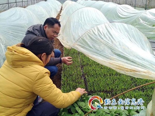 在爐山鎮新華村,已經播種下去的中藥材開始發芽,放眼望去一片翠綠,農技人員正蹲在地里指著一株幼苗認真地向農戶講解培植技巧。