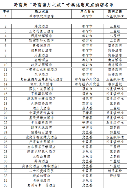 此外,黔南還推出“黔南蜜月之旅”專屬優(yōu)惠:在2020年1月20日(含1月20日)起登記結(jié)婚的全國(含港澳臺地區(qū))醫(yī)務工作者(含醫(yī)師、護士、藥師、醫(yī)學檢驗師/士)。在2020年12月31日前,憑本人有效期內(nèi)執(zhí)業(yè)證書、資格證書及結(jié)婚證,在黔南州內(nèi)定點酒店入住(不限定預訂及房費支付渠道),贈送升級房型一次。連續(xù)入住兩日可享受額外一日免費延住,連續(xù)入住四日或以上可享受額外兩日免費延住。
