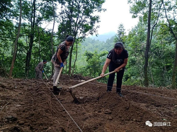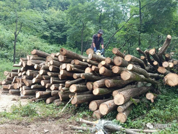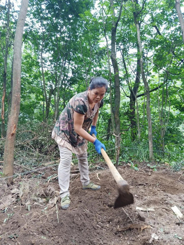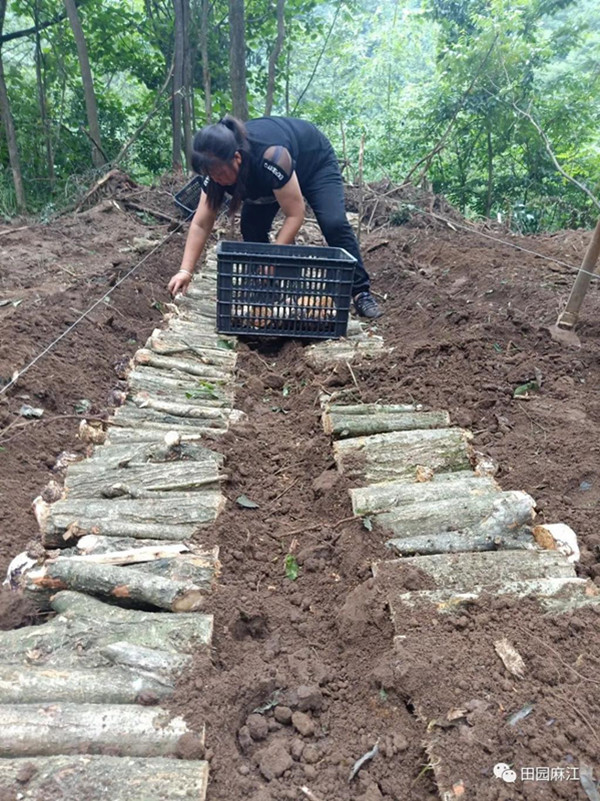 在蔥郁的闊葉林下,20 多個村民正在排線、起壟、培土,每個人都拼勁的干,趁著好天氣,村民們要將村合作社早些運來的蜜環菌棒和碎木段子提前放入土中,待菌棒和碎木段子進行兩個月的充分發酵后,正好趕上天麻的最佳種植期。