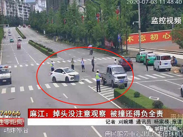 隨后民警調取了事發路段的監控視頻,從視頻上來看,白色小轎車當時是由麻江縣城沿長興大道往官井方向行駛,行駛至該路段時,突然從最右側車道掉頭往縣城方向行駛,掉頭時沒有發現直行方向的小型貨車,結果小型貨車撞在白色小車的左前角上,白色小轎車保險杠脫落,事故發生時雙方駕駛的速度也不算快。通過現場勘查,民警做出判定,事故是由于白色小轎車掉頭影響直行的小貨車造成的。