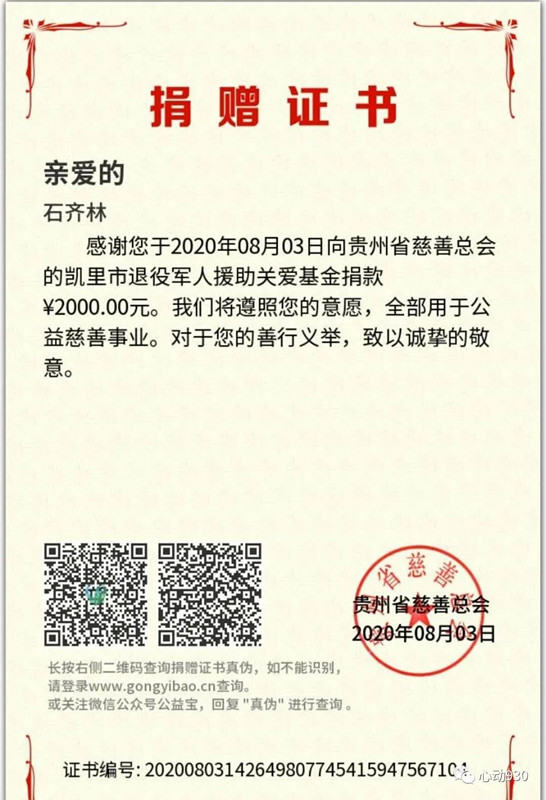 8月3日,凱里市一級殘疾軍人石齊林到凱里市退役軍人事務局向凱里市關愛退役軍人基金捐款2000元,這也是今年抗擊疫情以來石齊林又一次愛心捐款。