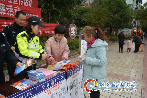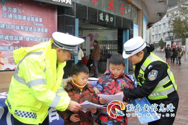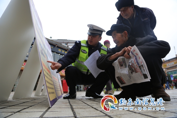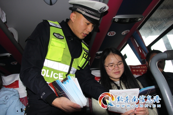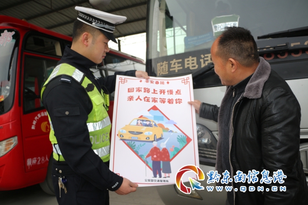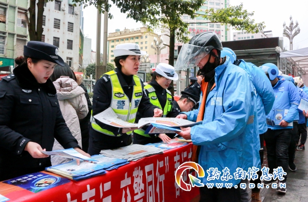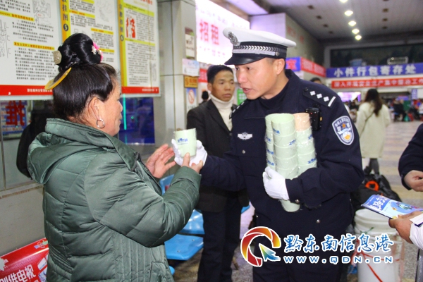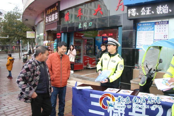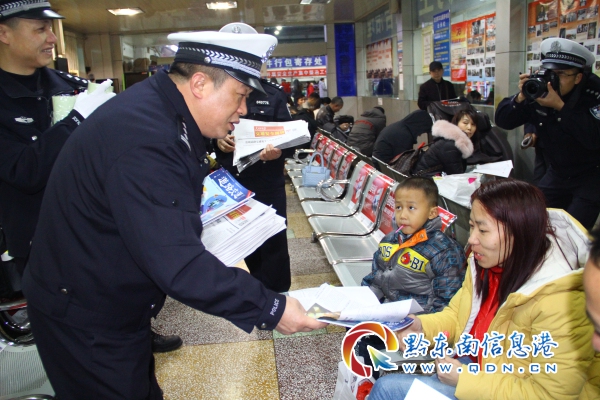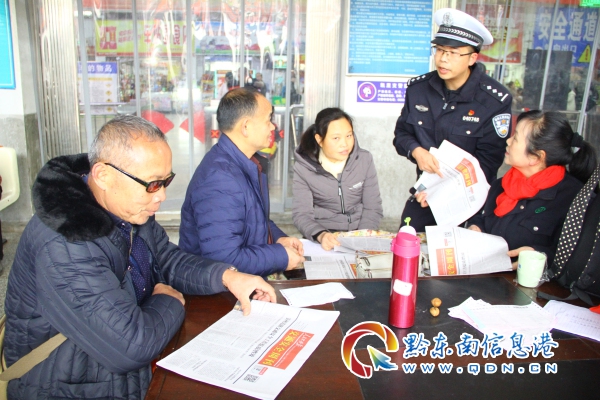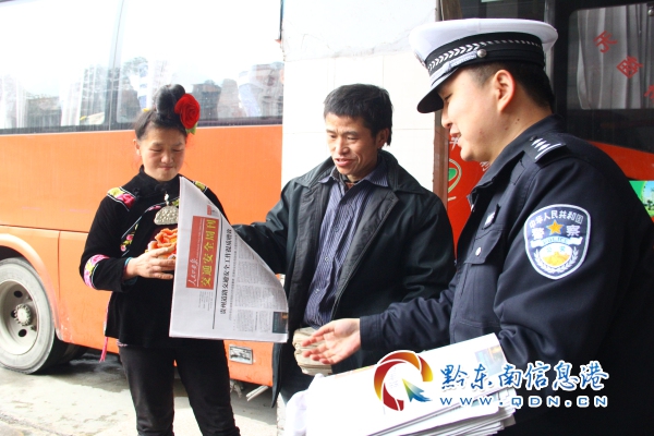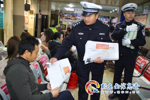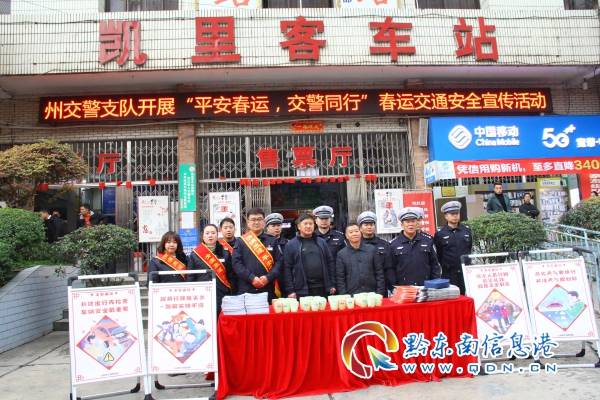黔東南州公安局交警支隊聯合凱運司在客車站門前開展“平安春運,交警同行”春運交通安全宣傳活動。