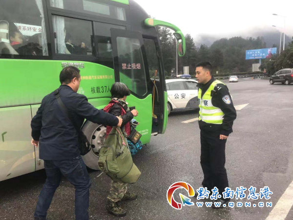 16日上午,高速一大隊一中隊民警接到報警稱在滬昆高速夾巖河大橋上,一名老人背著行李沿著高速公路行走。因為正值返鄉高峰,滬昆高速車流量大,情況十分危險。當民警找到老人時,因為害怕民警會對其處罰,老人一開始對民警的勸說十分抵觸,直到民警將老人扶上警車,老人情緒才穩定一些。通過交談,老人告訴民警自己是去都勻找子女過年,但因為不知道去哪里坐車,便一直沿著家門口的高速公路行走。但老人不知道,在民警找到她的地方距離都勻大概還有30公里。得知這一情況后,民警當即決定將老人送至麻江客車站乘坐都勻的班車,但當警車開到麻江服務區時,剛好有一輛開往都勻的班車正在加油,民警便委托班車駕駛員將老人帶到都勻客車站。