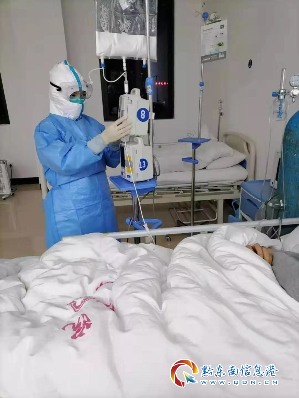 黃瑛是這次全州醫療團隊支援州人民醫院的一名護士,1月30日,從施秉縣人民醫院抽調到州醫院隔離病房,她和從全州各縣市醫院抽調來的醫療骨干日夜奮戰在抗疫第一線。作為一名黨員,也作為施秉縣重癥醫學科的一名“老兵”,新冠病毒疫情發生以來,黃瑛主動請纓要求加入到抗擊疫情的第一線,到州人民醫院報到后經過嚴格專業的培訓,黃瑛和其他醫護人員就投入到緊張的工作中。在護理崗位工作了七年的她雖然是一名有著豐富經驗的老護士,但面對來勢洶洶的疫情,她也是第一次走進隔離病房。“說實話,到隔離病房工作的第一天,自己內心還是十分忐忑和緊張”,黃瑛說到:“第一次穿上三層防護服走進隔離病房,與確診病人零距離接觸,為他們治療和護理,必須努力控制自己的緊張情緒,和他們聊天、還要安撫他們”。