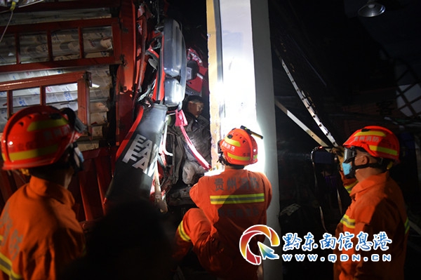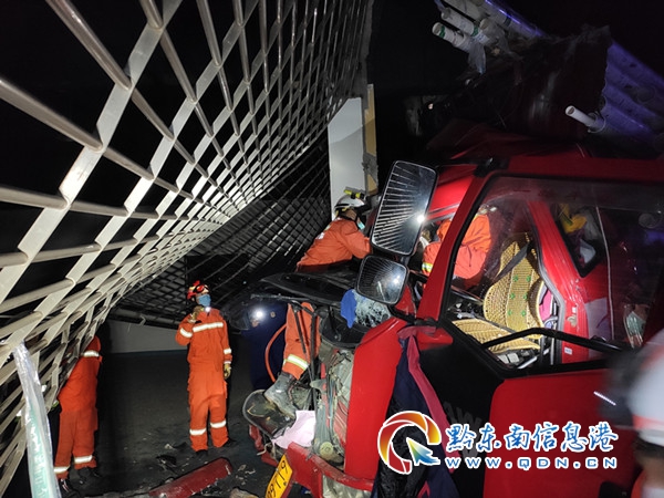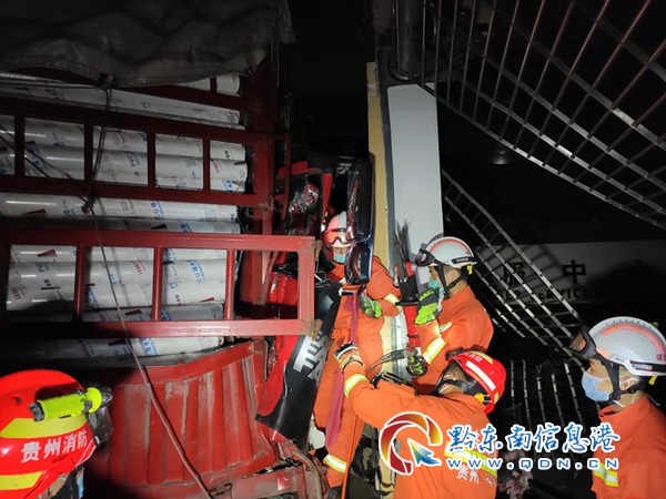 24時41分,岑鞏縣消防救援大隊到達現場。到場后發現,現場為一輛滿載塑料管道的貨車撞向了青溪紅酒廠廠房門口,車頭嚴重變形,副駕駛位置有一名被困人員,被困人員意識清醒,外部未見明顯傷口,只是右手和右腳被卡無法動彈。指揮員立即指揮隊員利用液壓工具對車頭位置進行剪切和擴展。
