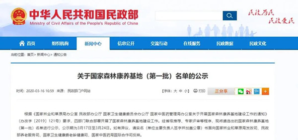 關于國家森林康養基地(第一批)名單的公示