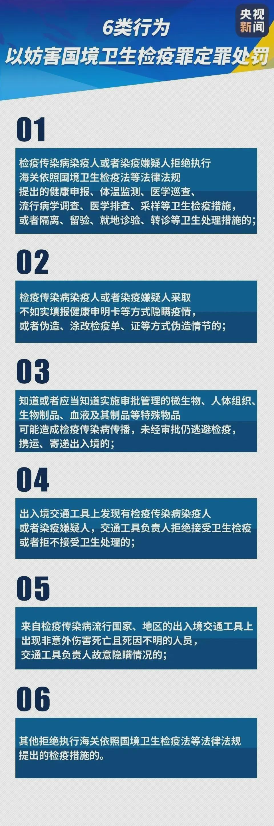 3月16日,最高人民法院、最高人民檢察院、公安部、司法部、海關總署聯合發布《關于進一步加強國境衛生檢疫工作 依法懲治妨害國境衛生檢疫違法犯罪的意見》。實施以下六類妨害國境衛生檢疫行為,如果引起鼠疫、霍亂、黃熱病以及新冠肺炎等國務院確定和公布的其他檢疫傳染病傳播或者有傳播嚴重危險的,將依照刑法第三百三十二條規定,以妨害國境衛生檢疫罪定罪處罰。