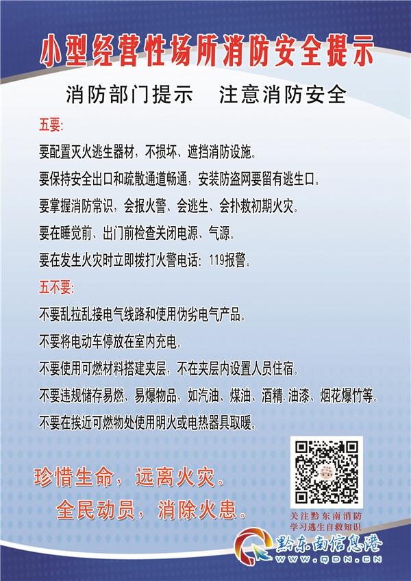 此次張貼的《小型經營性場所消防安全提示》分為“五要”、“五不要”兩個主要內容,正對性提醒小型經營性場所日常用火、用電安全、發現火災時及時撥打119、不要使用易燃易爆品等消防安全注意事項。在張貼期間,過往的群眾紛紛上前觀看,認真閱讀內容,宣傳員以此為契機,向群眾講解做好日常消防安全工作的重要性,提高群眾消防安全意識,最大限度的消除火災隱患。