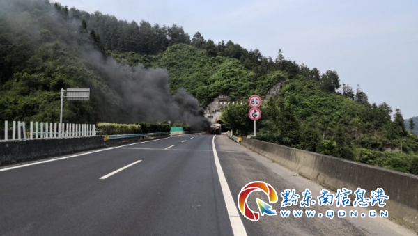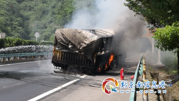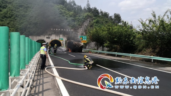 據(jù)駕駛員交代,車內(nèi)拉的是水泥,從貴州貴定運往湖南方向,當(dāng)車輛行駛至滬昆高速1602路段時,天氣炎熱高溫,車輛右后方輪胎突然爆胎,駕駛員立即采取制動措施,輪胎與路面摩擦,迅速引發(fā)火災(zāi)警情。車內(nèi)的兩名駕駛員,本想下車自救制止火勢蔓延,卻無奈察覺現(xiàn)場風(fēng)力太大,無法控制。為求自保,二人緊急逃生到前方隧道內(nèi)避險,眼看車輛燃起熊熊烈火,32噸水泥受熱噴涌而出。所幸,未造成人員傷亡。