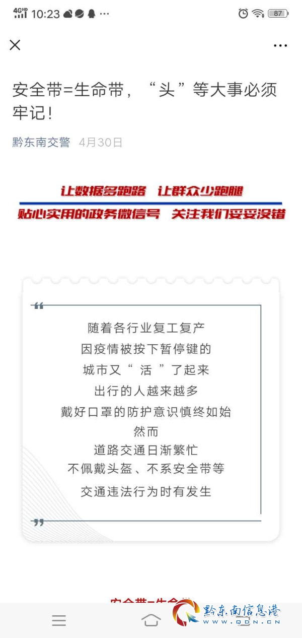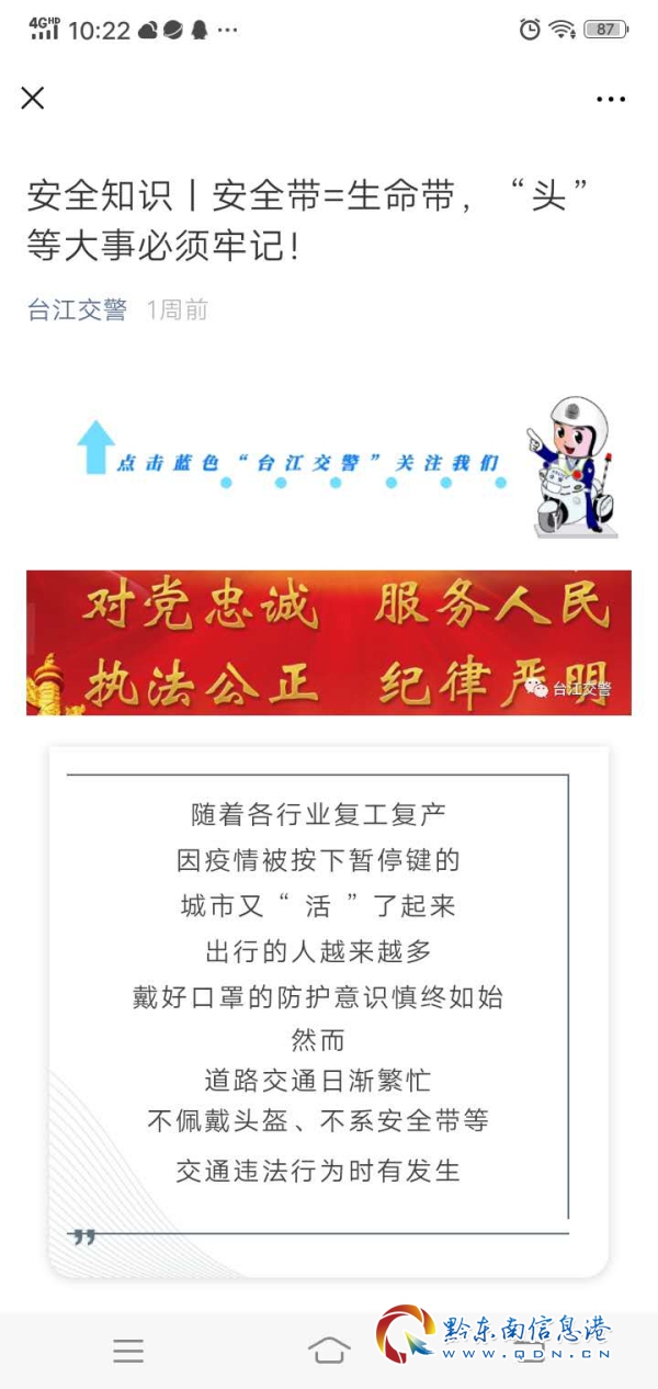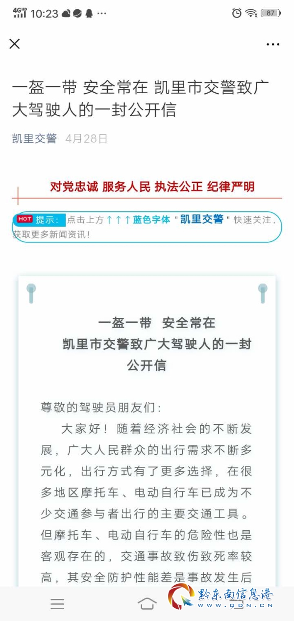 五、借力新媒體宣傳“一盔一帶”。凱里、鎮遠、雷山、榕江、黎平、臺江等交警大隊通過交警官方微博微信推送“一盔一帶”科普知識,懸掛橫幅標語及利用LED滾動播放“一盔一帶”宣傳標語,全力提高群眾對“一盔一帶”在道路交通安全工作中重要作用的認識,自覺養成戴好安全頭盔,系好安全帶的習慣。同時,加強與融媒體、報紙、網絡等新聞媒體的合作,曝光涉及“一盔一帶”的典型違法案例、事故案例,用身邊的案例提高群眾對“一盔一帶”的認識,支持理解交管部門開展整治行動的重要性,鼓勵廣大交通參與者“帶盔上路”。(唐光新/綜合整理)