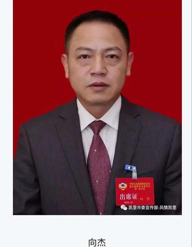 向杰,男,苗族,1969年10月出生,貴州省余慶縣人,大學文化,1990年8月參加工作。