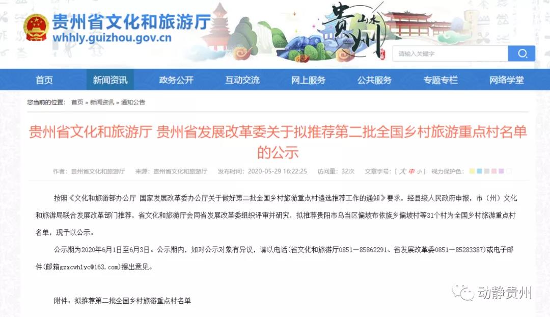 按照《文化和旅游部辦公廳 國家發展改革委辦公廳關于做好第二批全國鄉村旅游重點村遴選推薦工作的通知》要求,經縣級人民政府申報,市(州)文化和旅游局聯合發展改革部門推薦,省文化和旅游廳會同省發展改革委組織評審并研究,擬推薦貴陽市烏當區偏坡布依族鄉偏坡村等31個村為全國鄉村旅游重點村名單,現予以公示。