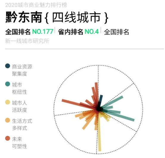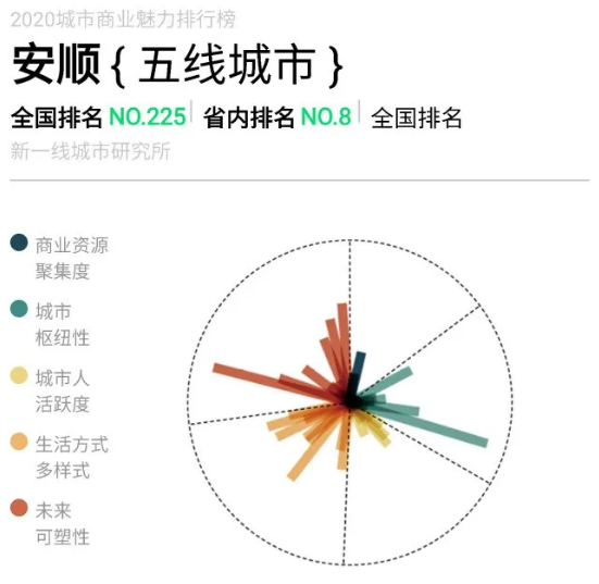 對貴州省來說,二線城市只有省會貴陽,三線城市只有遵義,其余7個市州較為靠后,黔南州、黔東南州、銅仁市為四線城市,其余為五線城市,其中安順較為意外,在貴州省排名倒數第二。