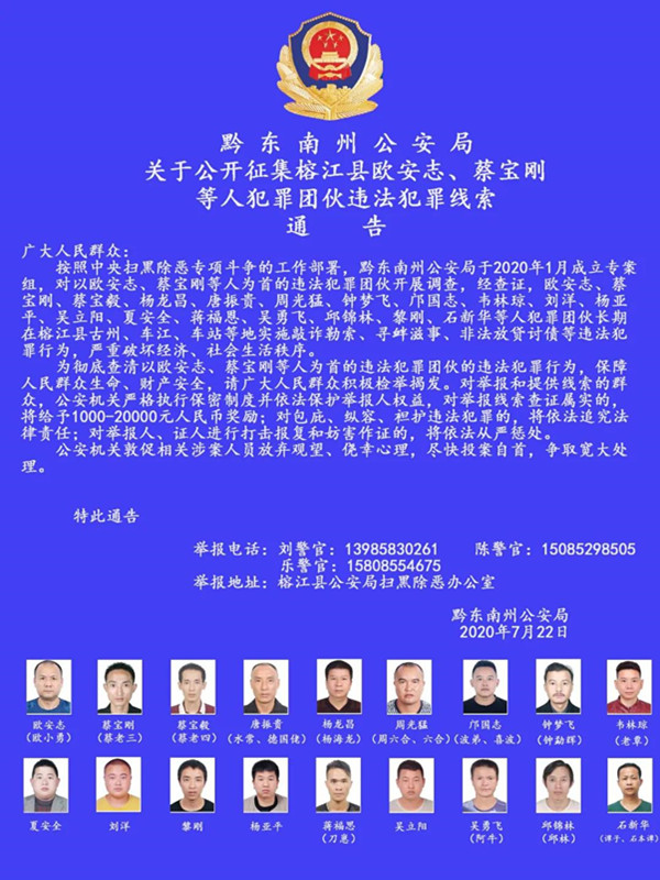 榕江縣歐安志、蔡寶剛等人犯罪團伙違法犯罪線索通告