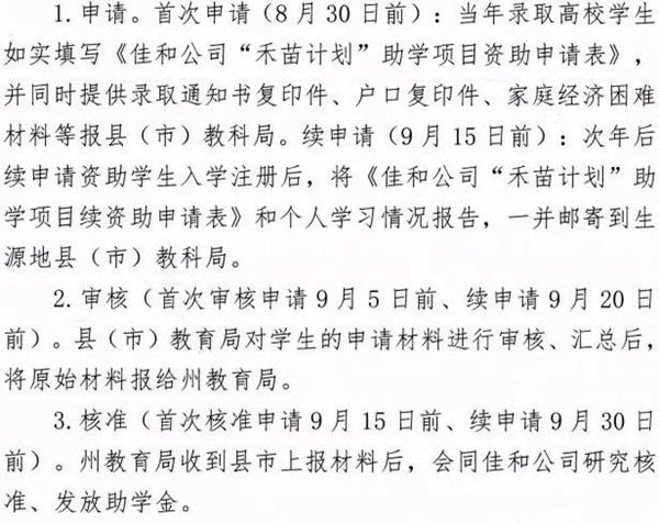 據介紹,“禾苗計劃”由省教育發展基金會、州教育局、人民網貴州頻道及全州各縣市教育科技局聯合發起,由貴州省佳和置業集團發展有限公司 有限公司出資2072萬元,從2020起至2030年止十年時間,用于資助黔東南州戶籍家庭經濟困難的一本高校新生,按照每人每年5000元的標準,直至資助到大學畢業,同時,佳和集團每年寒暑假還將向資助對象提供多個月薪2000元的勤工儉學崗位。據統計,“禾苗計劃”的實施將使我州1036名優秀寒門學子受益。