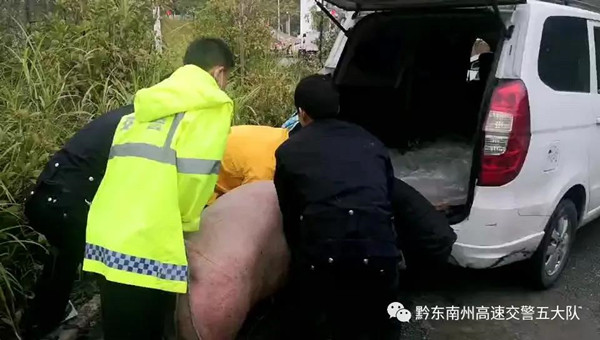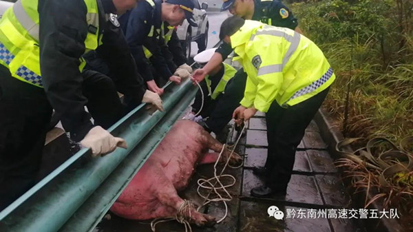 10月5日14時許,高速五大隊的值班民警接到報警,稱轄區天柱往錦屏方向高釀路段有一頭300多斤重的大豬在高速行車道上游蕩。