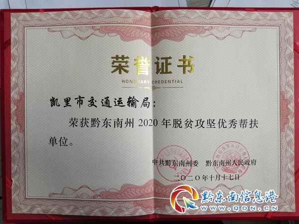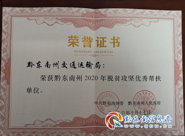 “黔東南州2020年脫貧攻堅(jiān)優(yōu)秀幫扶單位”:黔東南州交通運(yùn)輸局、凱里市交通運(yùn)輸局、丹寨縣交通運(yùn)輸局。