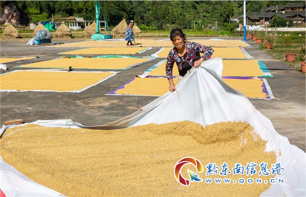 村民正在曬稻谷