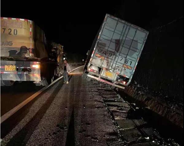 11月15日凌晨1時30分許,一輛滿載快遞包裹的貨車在G60滬昆高速K1652+000上行處發生側翻,20來噸的重型廂式貨車向睡著一樣被困于高速公路邊溝擋墻內,所幸無人員傷亡。