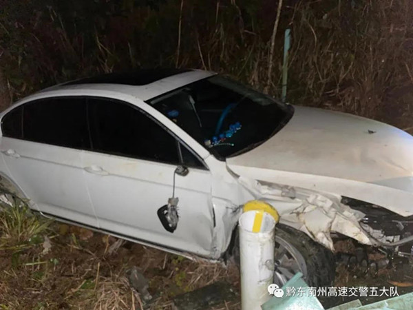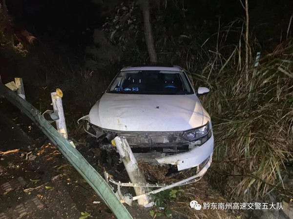 當(dāng)日晚上17時(shí),黔東南州高速交警五大隊(duì)接到報(bào)警,天黃高速款場路段一輛白色小車撞出護(hù)欄外,無人員受傷。民警隨即出警,到達(dá)現(xiàn)場后只見一輛小車已撞壞了護(hù)欄,沖出護(hù)欄外,車輛頭部“面目全非”受損嚴(yán)重”,車上人員幸好沒有受傷。