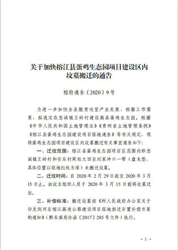 關于加快榕江縣蛋雞生態園項目建設區內墳墓搬遷的通告