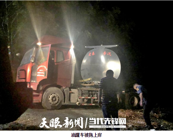 6月8日上午9時,洪水已經(jīng)淹沒到車子后輪。一旦車子下河,不但車子報廢,更重要的是瀝青是毒性物品,31噸的瀝青成了嚴(yán)重的污染源,其后果不堪設(shè)想。蔡錦同志馬上向縣委政府領(lǐng)導(dǎo)匯報,縣委常委、副縣長馬新菊同志親自到場指揮,當(dāng)即督促相關(guān)部門開展救援,縣應(yīng)急局、水務(wù)局、公路養(yǎng)護段、平江鎮(zhèn)主要領(lǐng)導(dǎo)帶領(lǐng)相關(guān)人員到場救援,除了到場的單位外,還馬上動員社會力量參與,211國道平永至樂里項目部等社會救援力量迅速趕往救援現(xiàn)場,整個搶救現(xiàn)場參與救援中大型機械16臺,參與救援人員100余人。第一方案,采取先用鋼纜牽引穩(wěn)固罐車,然后用吊車沿著斜坡硬拉上來,但考慮到罐體高溫,牽引硬拉易于損壞罐體,行不通,馬上調(diào)整方案,采取第二方案,對罐車前面已被洪水沖毀的路段進(jìn)行修復(fù),直接將車子拖出來。