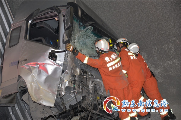 本網(wǎng)訊 12月21日下午,榕江縣境內(nèi)廈蓉高速公路榕江往都勻方向黃蒙隧道內(nèi)發(fā)生兩輛貨車追尾交通事故,一貨車司機(jī)被困車內(nèi),榕江縣消防救援大隊(duì)15時(shí)05分接警后于15時(shí)33分到達(dá)現(xiàn)場(chǎng)救援。