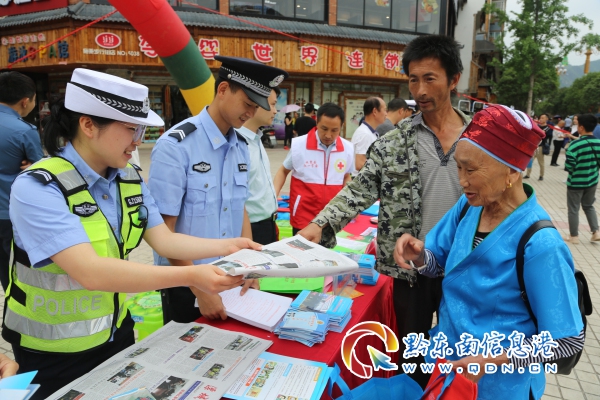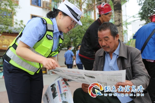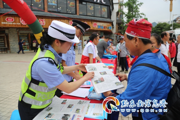活動現場,民警不斷為過往行人送上宣傳資料,積極解答關于道路交通安全知識的咨詢。當苗族同胞來到宣傳臺前時,民警即靈活利用苗族語言進行宣講,全方位、多角度講解交通安全法規,分析交通違法的嚴重危害,請大家一定要安全文明參與交通。