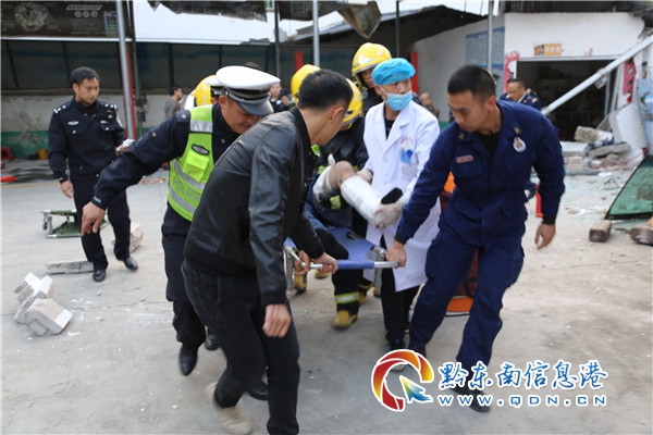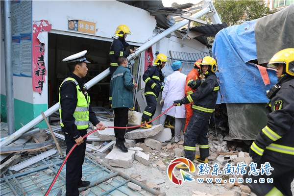 在事故現場,滿地都是車輛碎片和損毀廠房墻磚、玻璃碎片,廠房墻壁已撞壞,一輛藍色輕型倉柵式貨車車頭緊緊“抵”在修車廠廠房的墻上,貨車車頭嚴重變形把駕駛員死死卡住,讓其動彈不得。民警立即分工行動,一邊協助消防隊員破拆變形的駕駛室車頂、救助傷員;一邊在兩側來車方向設置警示標志,擺放錐形筒,分流車輛,做好交通安全防護;同時開展現場勘察、調查取證等工作。