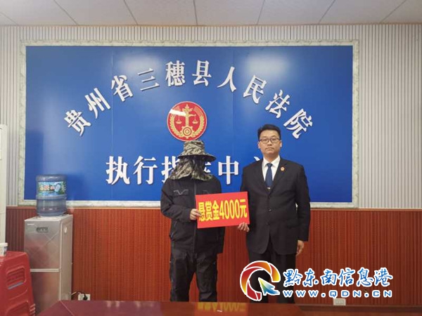 繼三穗法院公布懸賞執(zhí)行公告后,三穗法院執(zhí)行局陸續(xù)接到舉報(bào)人來(lái)電,執(zhí)行法官根據(jù)舉報(bào)人提供的有效線索,成功執(zhí)行到位40000元。4月13日,三穗法院向舉報(bào)人兌現(xiàn)懸賞金4000元。