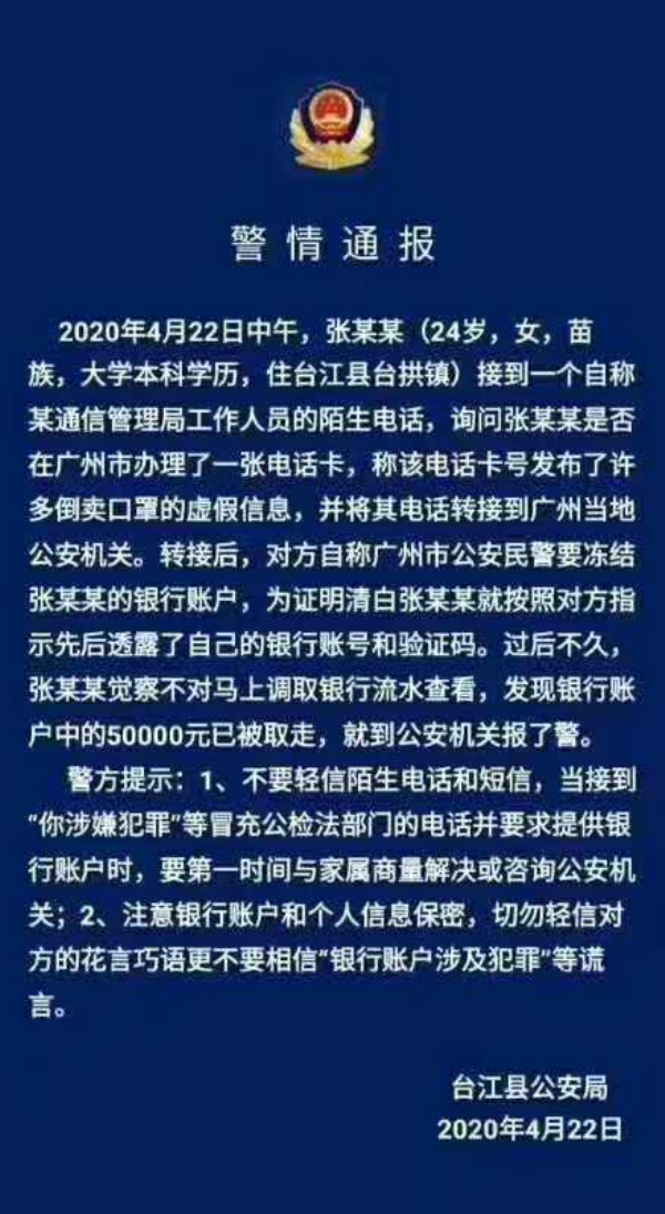 2020年4月22日中午,張某某(24歲,女,苗族,大學本科學歷,住臺江縣臺拱鎮)接到一個自稱某通信管理局工作人員的陌生電話,詢問張某某是否在廣州市辦理了一張電話卡,稱該電話卡號發布了許多倒賣口罩的虛假信息,并將其電話轉接到廣州當地公安機關。轉接后,對方自稱廣州市公安民警要凍結張某某的銀行賬戶,為證明清白張某某就按照對方指示先后透露了自己的銀行賬號和驗證碼。過后不久,張某某覺察不對馬上調取銀行流水查看,發現銀行賬戶中的50000元已被取走,就到公安機關報了警。