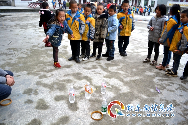 每個活動都設有組織者,安全員及助手,活動開始后,學生有組織、有順序地進行活動,在各種活動點競賽后由負責老師發獎券,最后憑獎券去兌換獎品。活動豐富多彩,吸引了絕大數學生參加。有傳統的《猜謎語》,有趣味性十足的《彈彈珠》、《比比誰運氣好》、《夾彈子》、《吹球過碗》、《貼鼻子》等,有運動性的《搶凳子》、《趣味保齡球》、《套圈》,有考驗智力的《腦筋急轉彎》、《我比你猜》,還穿插有妙趣橫生的老師參與的項目《穿越呼啦圈》。為了鼓勵學生的參與精神,學校分發獎券頒發獎品,雖然禮物很輕,僅僅是一只筆,一顆棒棒糖,一塊橡皮,一個筆記本,但代表了學校對孩子們的激勵與新年祝福。