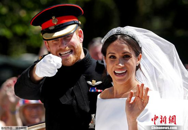 2018年5月19日,英國溫莎城堡圣喬治教堂,哈里王子大婚,儀式結束后和妻子梅根坐在馬車上。DAMIR SAGOLJ