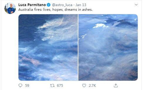 據(jù)報(bào)道,帕爾米塔諾13日在社交媒體上發(fā)布了從太空俯瞰澳大利亞林火的照片,他還表示,“與其他宇航員交談后得知,我們中間從沒(méi)有人見(jiàn)過(guò)如此大規(guī)模的森林火災(zāi)。”