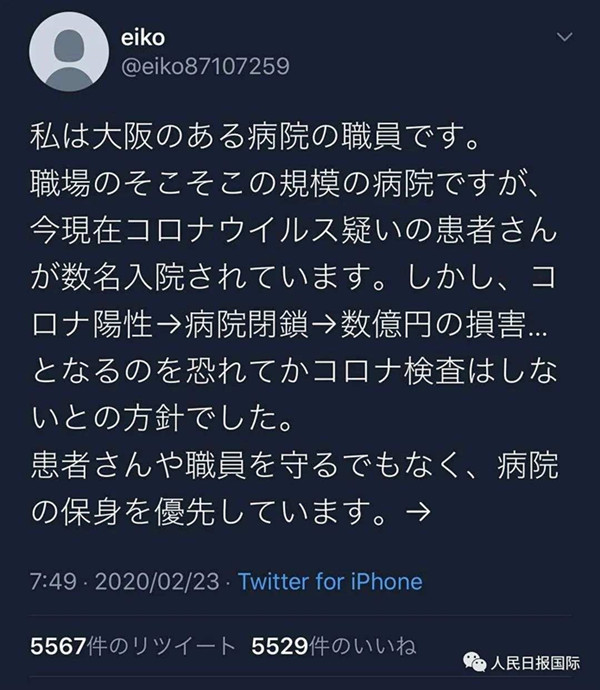 記者注意到,在網(wǎng)上,有關(guān)疫情的報(bào)道下面有不少批評日本政府應(yīng)對遲緩的留言。網(wǎng)上還出現(xiàn)很多輾轉(zhuǎn)多家醫(yī)院卻得不到檢測和救治的案例。“我是大阪一家有一定規(guī)模醫(yī)院的員工,醫(yī)院已經(jīng)入住數(shù)名疑似新冠肺炎患者。如果醫(yī)院確診新冠肺炎病例,醫(yī)院將關(guān)門,將有數(shù)億日元的損失……在這種邏輯下,醫(yī)院采取了不檢測的方針。”有人在社交媒體上寫道。