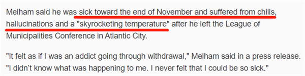 據(jù)梅勒姆回憶,他在2019年11月前往大西洋城參加一場(chǎng)會(huì)議,11月21日回程時(shí)突感不適,回到家后開始出現(xiàn)高燒、寒戰(zhàn)、發(fā)冷等一系列癥狀。梅勒姆將其發(fā)病癥狀與醫(yī)生溝通后,醫(yī)生認(rèn)為他感染了流感,在沒有做任何檢測(cè)的情況下,他當(dāng)時(shí)也接受了這一說法。