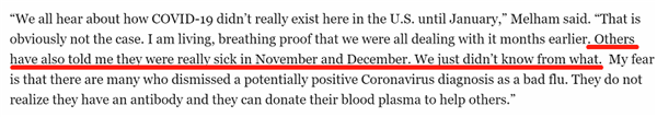 梅勒姆認(rèn)為,此前許多重癥流感很可能就是新冠肺炎,他身邊也有很多人曾在去年11、12月生病且癥狀嚴(yán)重。
