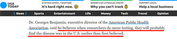 3月底,美國公共衛(wèi)生協(xié)會(huì)執(zhí)行董事喬治·本杰明曾表示:“我們最終會(huì)發(fā)現(xiàn),新冠病毒的到來可能比我們想象的要早得多。”