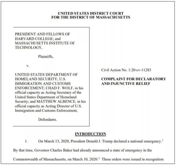 該訴訟尋求法院頒布禁令禁止美國國土安全部、移民和海關(guān)執(zhí)法局執(zhí)行聯(lián)邦政府規(guī)定。之前,美國聯(lián)邦政府要求美國大學(xué)禁止僅參加在線課程的國際學(xué)生留在美國,此舉意味著很多外國留學(xué)生如果不能參加線下課程,就必須離開美國。