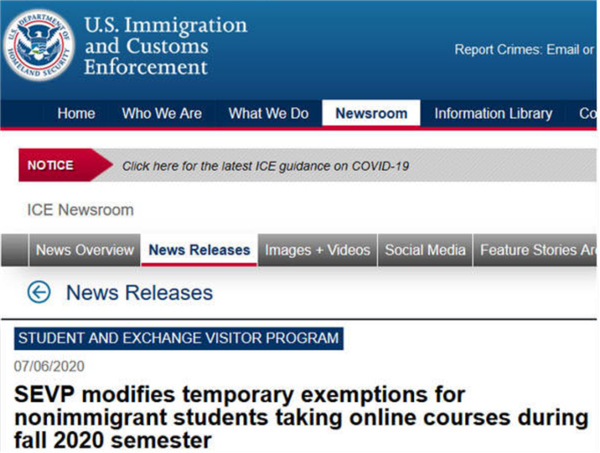 美國國土安全部、移民和海關(guān)執(zhí)法局早前表示,今年秋季學(xué)期僅接受線上授課的國際學(xué)生將面臨無法入境、已經(jīng)在美國的國際學(xué)生將面臨被驅(qū)逐的后果。