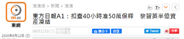 黎智英獲準(zhǔn)保釋,港媒稱其5000萬(wàn)港元資產(chǎn)被凍結(jié)。