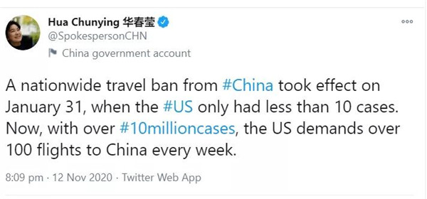 對于這一言論,外交部發言人華春瑩12日在推特上直接回懟稱:“1月31日,當美國只有不到10個新冠肺炎病例的時候,一個針對中國的全國旅行禁令生效了。如今,美國的確診病例數超過了1000萬,卻要求每周有超過100個飛往中國的航班。”