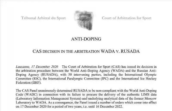 北京時間 17 日晚 11 時,國際體育仲裁法庭(CAS)宣布,認定俄羅斯反興奮劑中心違規,并對俄羅斯反興奮劑中心(RUSADA)處以為期兩年的一系列處罰。2020 年 12 月 17 日至 2022 年 12 月 16 日的兩年間,俄羅斯將不得參加包括東京奧運會及各項目世界錦標賽在內的重大國際體育賽事。