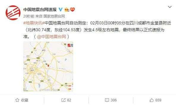 #地震快訊#中國地震臺網自動測定:02月03日00時05分在四川成都市金堂縣附近(北緯30.74度,東經104.53度)發生4.5級左右地震,最終結果以正式速報為準。( @中國地震臺網 )